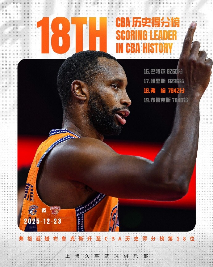 里程碑之夜!弗格CBA生涯得分来到7842 超越马尚升至历史第18位