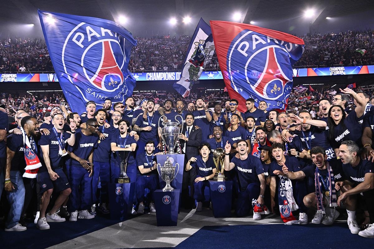 冠军后,巴黎在王子公园球场举行夺冠庆典,展示四座冠军奖杯(