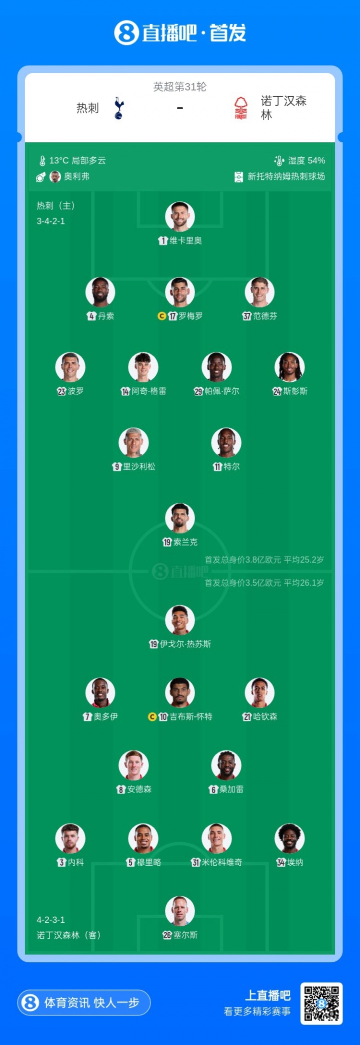 赛前热刺积30分排第16,森林积29分排第17,本场比赛是名副其实的保级大战!近三次交手,热刺全部败在森林脚下,上赛季还遭到对手双杀。