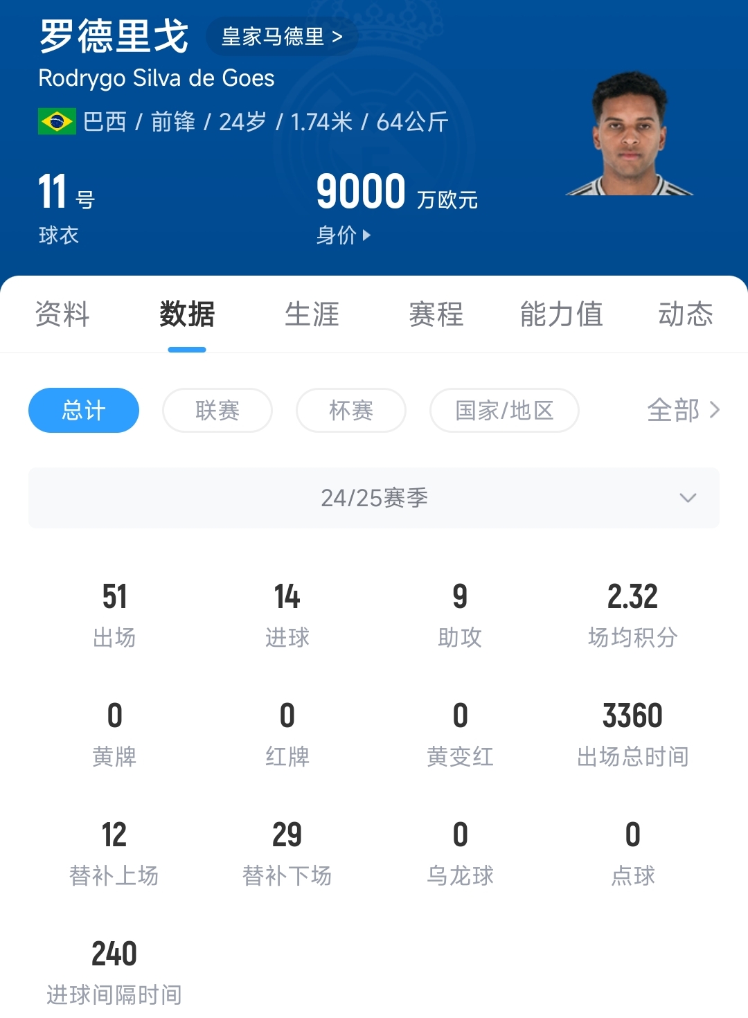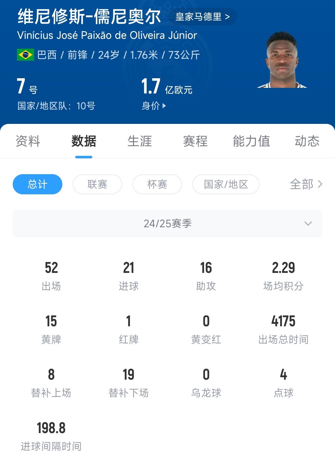 06月09日讯 德国足球转会市场今日更新了西甲球员身价,皇马阵中的巴西双子星,维尼修斯和罗德里戈的身价均迎来不同程度的下跌。24岁的维尼修斯身价下跌3000万欧元,由2亿欧跌至1.7亿欧;本赛季维尼修斯代表皇马出战52场比赛,贡献21粒进球和16次助攻;24岁的罗德里戈身价下跌1000万欧元,由1亿欧跌至9000万欧;本赛季罗德里戈代表皇马出战51场比赛,贡献14粒进球和9次助攻。