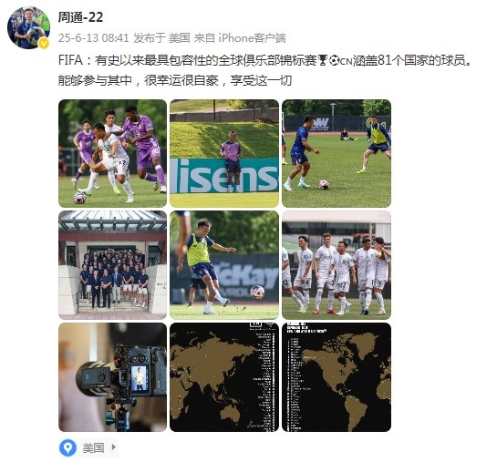 6月13日讯 即将代表奥克兰城参加世俱杯的周通,在社媒发文谈到了自己的感受。本届世俱杯赛事,来自新西兰的奥克兰城是唯一的大洋洲球队,他们与拜仁、本菲卡和博卡一同分在C组。对于能够参加这届赛事,周通在社媒写道:FIFA:有史以来最具包容性的全球俱乐部锦标赛⚽️涵盖81个国家的球员。能够参与其中,很幸运很自豪,享受这一切