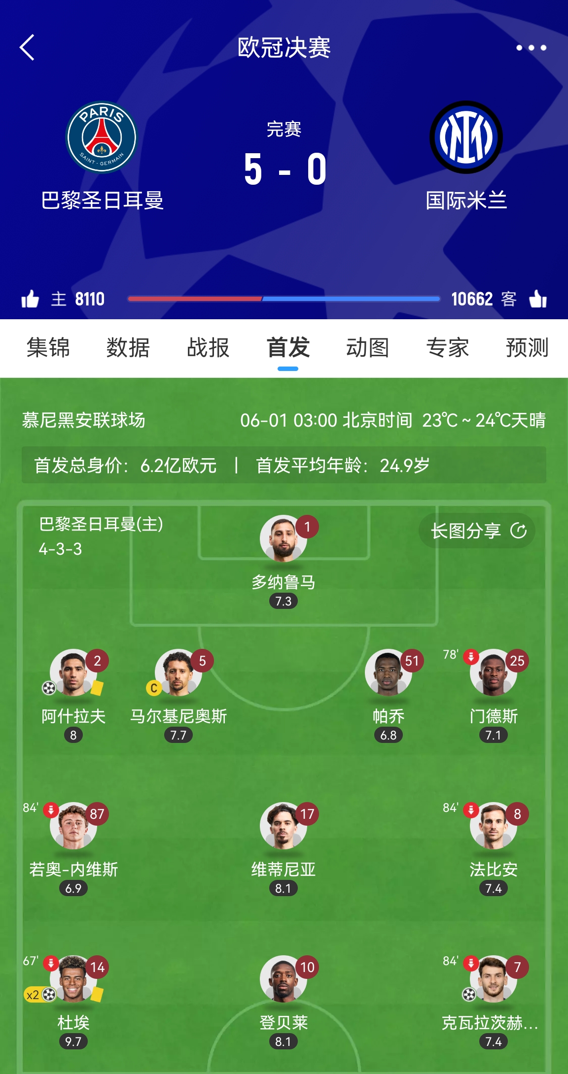 巴黎首发身价7.4亿&是迈阿密20倍,对比欧冠决赛巴尔科拉替登贝莱