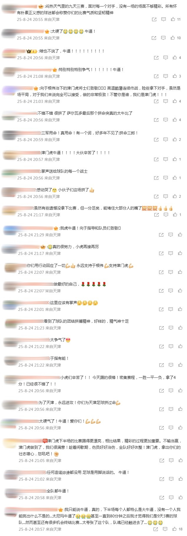 8月24日讯 在中超联赛第22轮中,天津津门虎客场1-1战平上海海港。此役津门虎表现出色,并一度占据优势,这样的表现为他们赢得了球迷的广泛认可。 由于此前在与上海海港的比赛中采取阵容轮换,天津津门虎一度被质疑有“放水”的意味。不过经过今天的比赛,津门虎成功摆脱了种种质疑的声音。