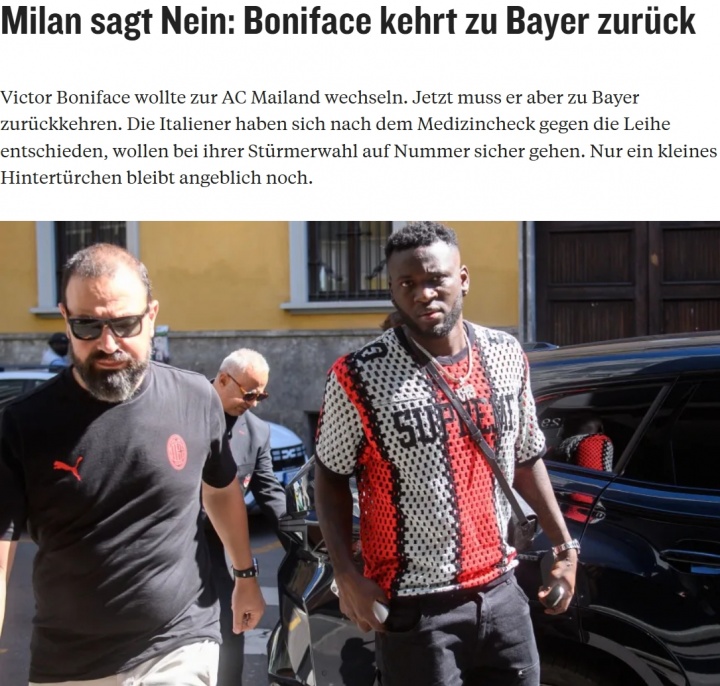 交易失败!踢球者:博尼法斯体检结果异常,AC米兰否决了签约