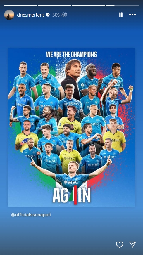 曾为那不勒斯出场397次!默滕斯转发那不勒斯夺冠海报